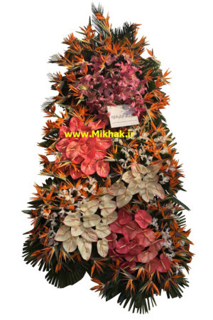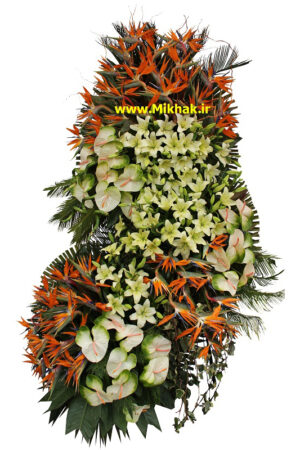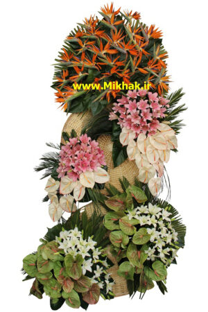 بزرگ و تشریفاتی ۲۵۷در این سبد گل بزرگ وتشریفاتی از۵۰آنتریوم،۲۰لیلیوم،۱۰۰ استرلزیا استفاده شده است که این گلها همگی درون یک پایه گل زیبا همراه با برگ های تازه تزئین شده است. اندازه تقریبی این پایه گل ۲۰۰ سانت ارتفاع میباشد.