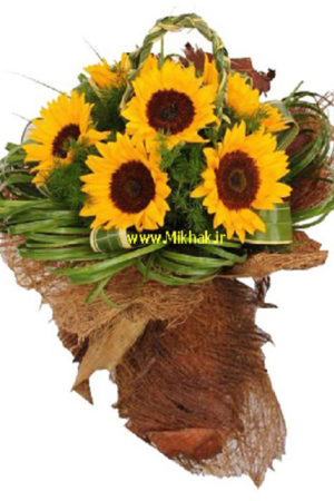 دسته گل ۴۱۰در این دسته گل از۵آفتاب گردان استفاده شده است که این گلها همگی درون یک دسته گل زیبا همراه با برگ های تازه تزئین شده است. اندازه تقریبی این دسته گل۴۰ سانت ارتفاع میباشد.