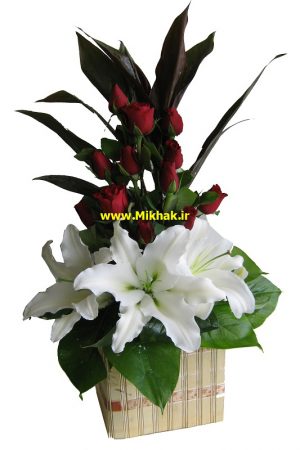 سبدگل ۱۲۶در این سبد گل از ۸ آنتریوم، ۴ لیلیوم، ۵ رز، ۱دسته لیسیانتوس استفاده شده است که این گلها همگی درون یک سبد گل زیبا همراه با برگ های تازه تزئین شده است. اندازه تقریبی ارتفاع این سبد گل ۶۰ سانتیمتر میباشد.