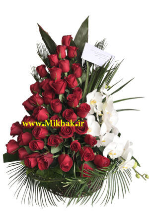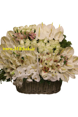 بزرگ و تشریفاتی ۲۷۳در این سبد گل بزرگ و تشریفاتی از ۷۰ آنتریوم، ۱۰ لیلیوم، ۲۰ آلسترومریا استفاده شده است که این گلها همگی درون یک پایه گل زیبا همراه با برگ های تازه تزئین شده است. اندازه تقریبی این پایه گل ۱/۵ متر ارتفاع میباشد.