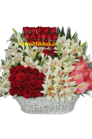 سبد گل ۱۴۸در این سبد گل از گلهای آنتریم، لیلیوم و رز استفاده شده است که این گلها همگی درون یک سبد گل زیبا همراه با برگ های تازه تزئین شده است. اندازه تقریبی ارتفاع این سبد گل ۶۰ سانتیمتر میباشد.