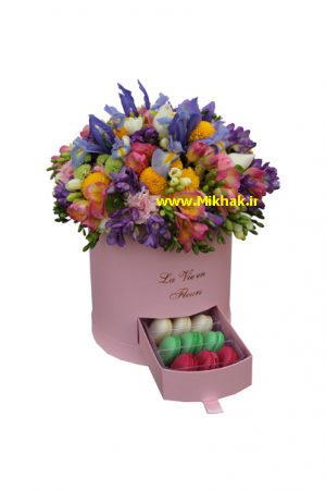 جعبه گل ۶۴۲در این جعبه گل از گلهای لیسیانتوس، میخک مینیاتوری، آلسترومریا استفاده شده است که این گلها همگی درون یک جعبه گل زیبا همراه با برگ های تازه تزئین شده است. اندازه تقریبی ارتفاع این جعبه گل ۵۰ سانتیمتر میباشد.
