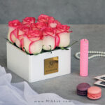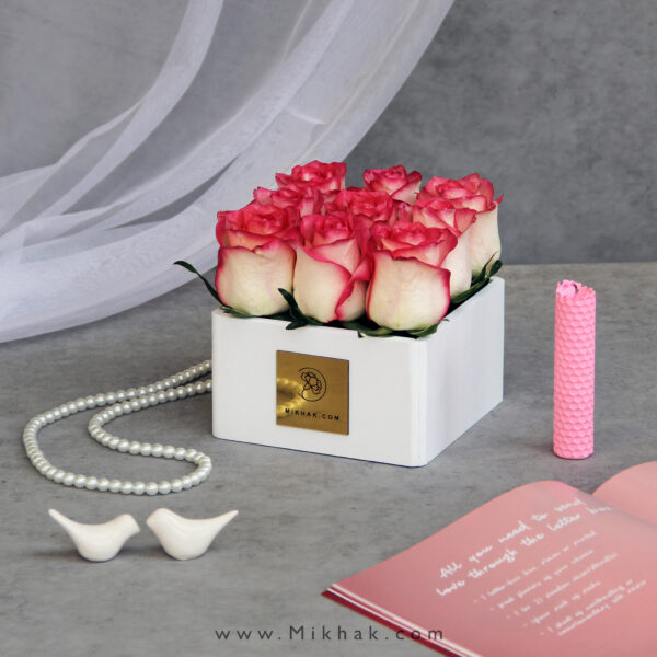 در این جعبه گل از گل ۹ شاخه رز استفاده شده است که این گلها همگی درون یک جعبه گل زیبا همراه با برگ های تازه تزئین شده است. اندازه تقریبی ارتفاع این جعبه گل ۲۰ سانتیمتر میباشد.