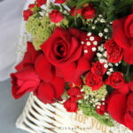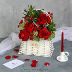 در این سبد گل از گلهای رز و رز مینیاتوری استفاده شده است که این گلها همگی درون یک سبد گل زیبا همراه با برگ های تازه تزئین شده است. اندازه تقریبی ارتفاع این سبد گل ۶۰ سانتیمتر میباشد.