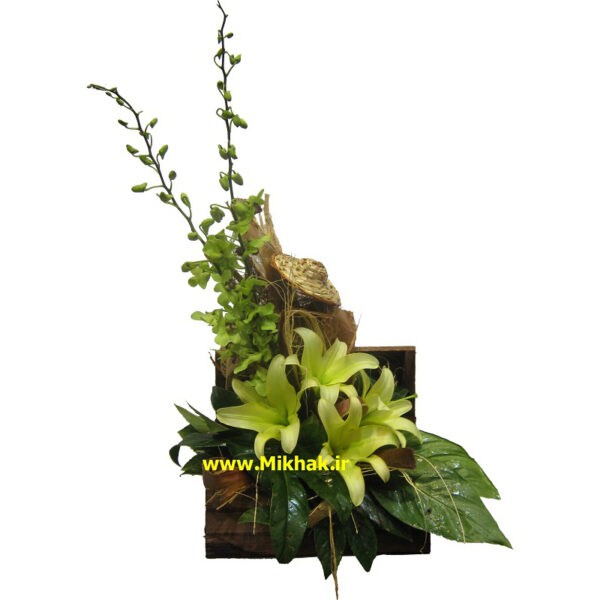 در این سبد گل از۴لیلیوم و۲ ارکیده  استفاده شده است که این گلها همگی درون یک سبد گل زیبا همراه با برگ های تازه تزئین شده است. اندازه تقریبی این سبد گل ۴۵ سانت ارتفاع  میباشد.