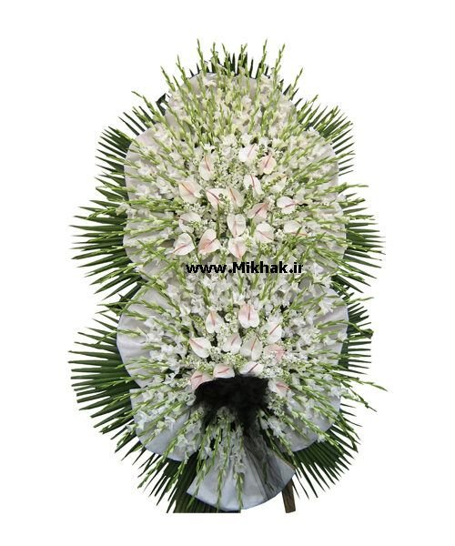 در این سبد گل ترحیم ازگلایل و ۲۸ آنتریوم  استفاده شده است که این گلها همگی درون یک پایه گل زیبا همراه با برگ های تازه تزئین شده است. اندازه تقریبی این دسته گل ۲۲۰سانت ارتفاع میباشد.