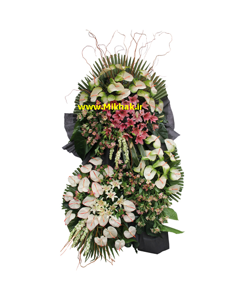 در این سبد گل ترحیم از لیلیوم ،آنتریوم ،آلسترومریا ، مریم استفاده شده است که این گلها همگی درون یک پایه گل زیبا همراه با برگ های تازه تزئین شده است. اندازه تقریبی این پایه گل ۲۱۰سانت ارتفاع میباشد.