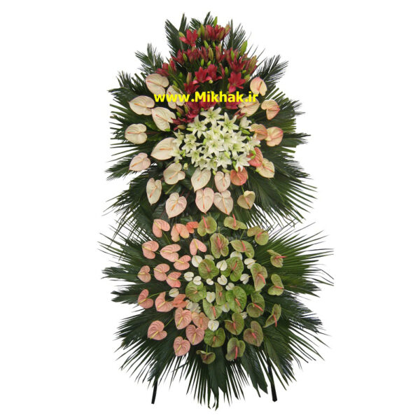 در این سبد گل بزرگ وتشریفاتی از۷۵آنتریوم،۴۶لیلیوم استفاده شده است که این گلها همگی درون یک پایه گل زیبا همراه با برگ های تازه تزئین شده است. اندازه تقریبی این پایه گل ۲۲۰ سانت ارتفاع  میباشد.