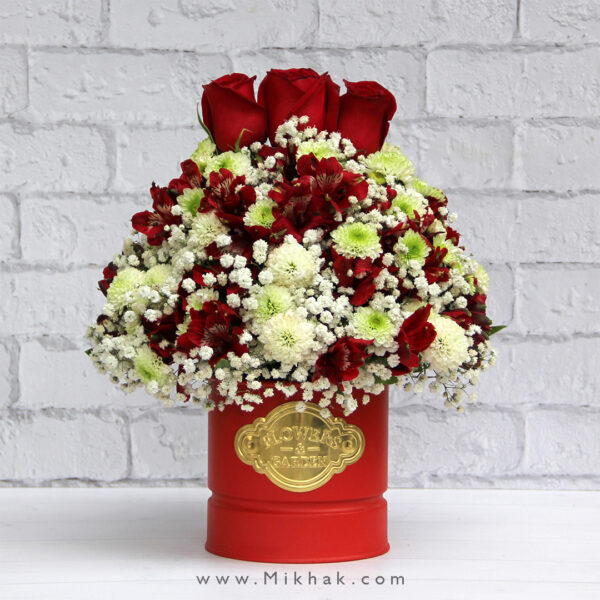در این جعبه گل از داودی مینیاتوری، رز، آلسترومریا استفاده شده است که این گلها همگی درون یک جعبه گل زیبا همراه با برگ های تازه تزئین شده است. اندازه تقریبی ارتفاع این جعبه گل ۵۰ سانتیمتر میباشد.