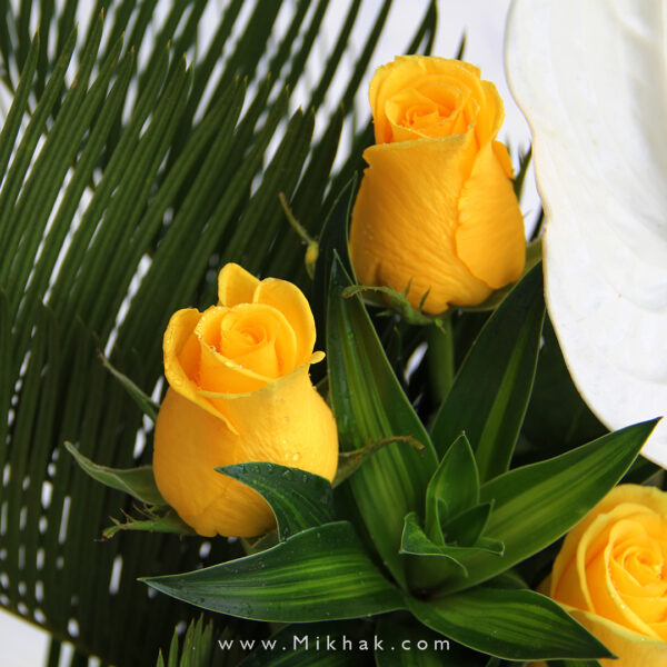 در این سبد گل از ۶ آنتریم، ۳ لیلیوم، لیسانتوس، ۴ رز، ۳ آلسترومریا استفاده شده است که این گلها همگی درون یک سبد گل زیبا همراه با برگ های تازه تزئین شده است. اندازه تقریبی ارتفاع این سبد گل ۶۰ سانتیمتر میباشد.