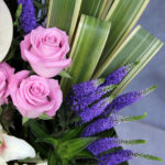 در این سبد گل از ۷ آنتریم، ۵ لیلیوم، ۵ رز استفاده شده است که این گلها همگی درون یک سبد گل زیبا همراه با برگ های تازه تزئین شده است. اندازه تقریبی ارتفاع این سبد گل ۶۰ سانتیمتر میباشد.