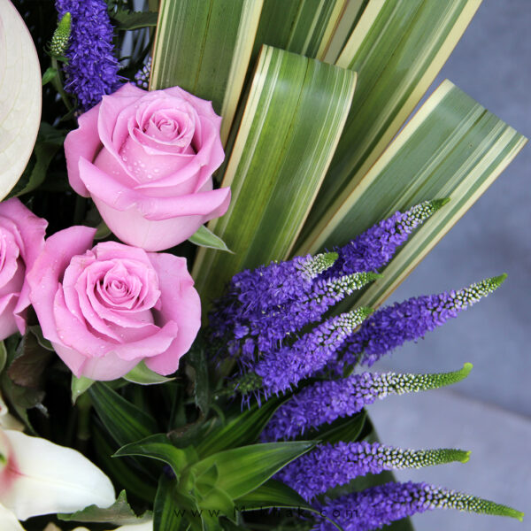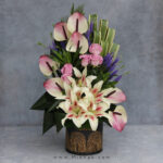در این سبد گل از 7 آنتریم، 5 لیلیوم، 5 رز استفاده شده است که این گلها همگی درون یک سبد گل زیبا همراه با برگ های تازه تزئین شده است. اندازه تقریبی ارتفاع این سبد گل ۶۰ سانتیمتر میباشد.