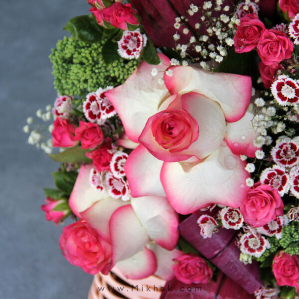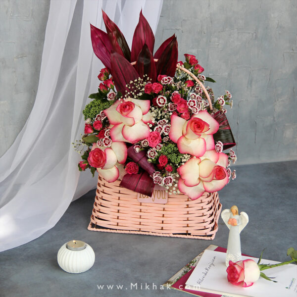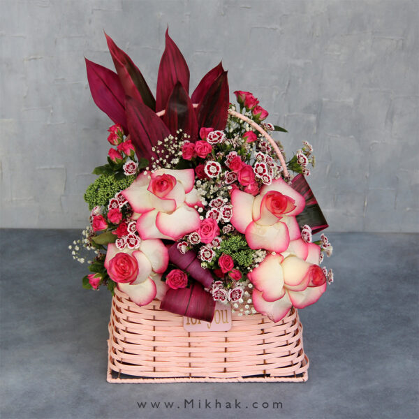در این سبد گل از گلهای رز و رز مینیاتوری استفاده شده است که این گلها همگی درون یک سبد گل زیبا همراه با برگ های تازه تزئین شده است. اندازه تقریبی ارتفاع این سبد گل ۶۰ سانتیمتر میباشد.
