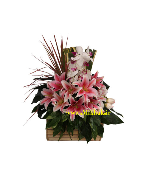 در این سبد گل از 10لیلیوم،4رز و 1 ارکیده استفاده شده است که این گلها همگی درون یک سبد گل زیبا همراه با برگ های تازه تزئین شده است. اندازه تقریبی این سبد گل 60 سانت ارتفاع میباشد.